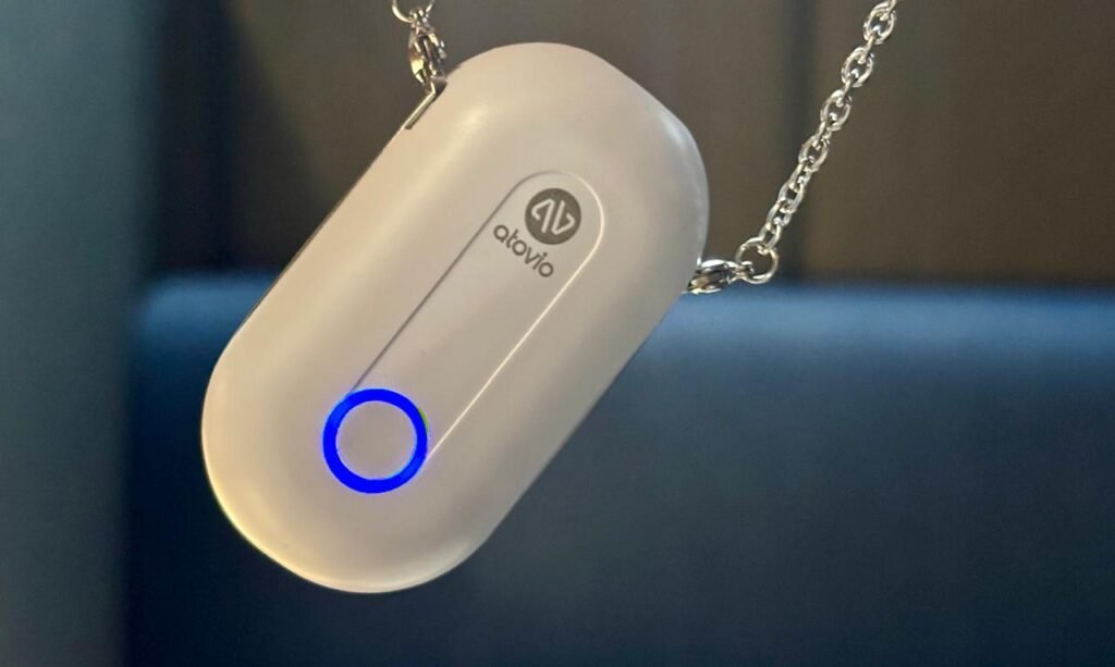 At first glance, the Atovio Pebble lives up to its name, it’s a smooth, oval-shaped pendant no larger than a large pebble, measuring about 6cm in height and weighing a featherlight 30 grams. Made up of matte plastic to resist fingerprints and scratches, it gives a minimalist vibe that’s more jewelry than gadget. A subtle chrome strip bisects the body, serving both aesthetic and functional purposes by anchoring the lanyard ends and completing the electrical circuit needed for operation. The front sports the Atovio logo and a multifunctional LED ring that pulses in soft blues and greens, means solid blue for normal mode, flashing for low battery, and a vibrant turbo glow when pollution demands extra firepower.