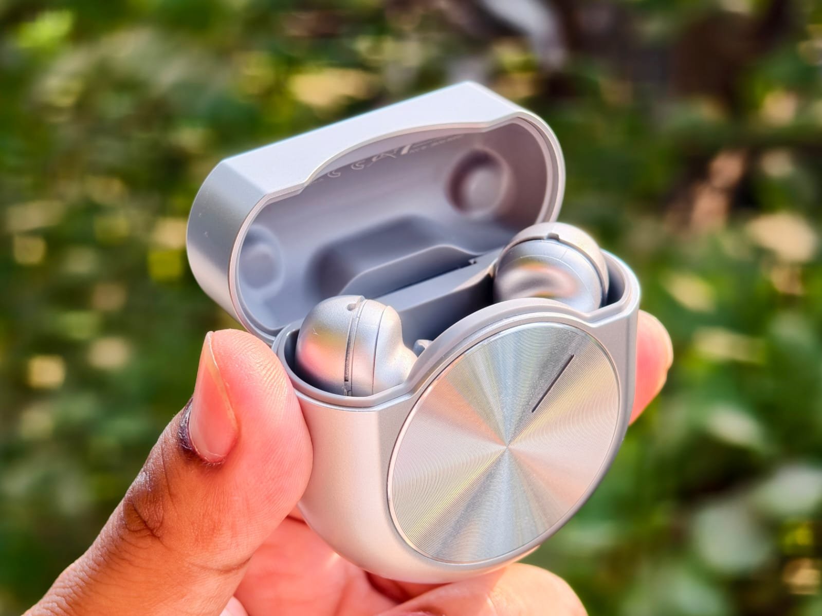 At first glance, the Master Buds 2 look almost identical to their predecessor. The charging case still sports that distinctive vinyl-record-inspired circular metal disc on the lid, complete with a glowing LED strip that pulses during pairing or charging. It feels premium and tactile, with a brushed-metal finish that resists fingerprints better than glossy alternatives. However, the case has grown noticeably larger and chunkier, roughly 59 x 58 x 26 mm and weighing about 62.4 g. The edges are sharper than the softly curved first-gen model, making it slightly less pocket-friendly for jeans or slim shorts. It’s still compact enough for most pockets, but you’ll notice the difference if you’ve carried the original daily.